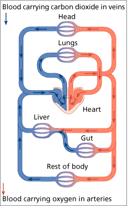 ![]() The blood always circulates through the body in the same direction. As well as oxygen and carbon dioxide, many other substances are carried in the blood. The blood circulating through the digestive system picks up digested food products and carries them to the liver to be used or stored.