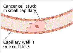 The circulation can help explain why some cancers nearly always spread to the same place. Cancers of the colon (large bowel) often spread to the liver. This is because blood circulates from the bowel through the liver on its way back from the heart. If there is a cancer in the large bowel, and some cancer cells have found there way into the circulation, they may stick in the liver as the blood passes through. They can then begin to grow into secondary cancers.